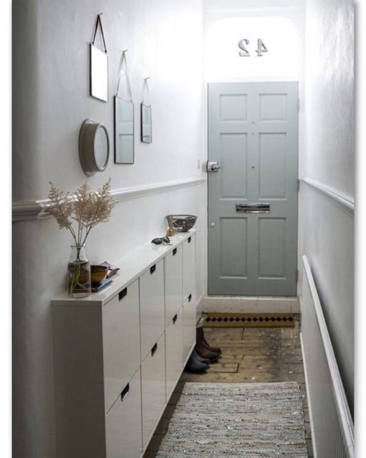 This space feels incredibly practical without losing its charm. The long white storage unit keeps shoes tucked away, which instantly makes the narrow hallway feel more open. Soft wall colors and simple mirrors keep everything light and balanced. I like how the runner adds texture and warmth while guiding you straight to the door. It feels like a hallway that stays tidy even on busy days, making coming home feel easy and organized rather than cluttered or stressful.