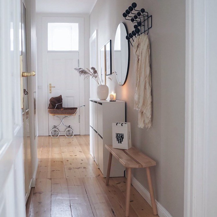 I love how calm and welcoming this narrow hallway feels the moment you step inside. The light wood floors bounce natural light around, making the space feel open instead of tight. A slim white cabinet keeps things tidy without crowding the walkway, while the round mirror adds softness and depth. The small bench feels practical and cozy, like a spot to pause and drop your bag. Neutral walls, gentle textures, and a few simple accessories make this hallway feel lived in and easy, the kind of space that quietly sets the tone for the rest of the home.